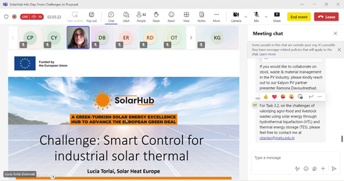 The SolarHub Info Day convened over 40 participants from Türkiye and Greece in an online format. The event provided a practical platform for turning industrial needs into research and innovation proposals, with a strong emphasis on Horizon Europe Cluster 5 and the GR-TR Bilateral Call. Speakers shared funding alignment strategies, challenge-owner presentations, and best practices for proposal development.