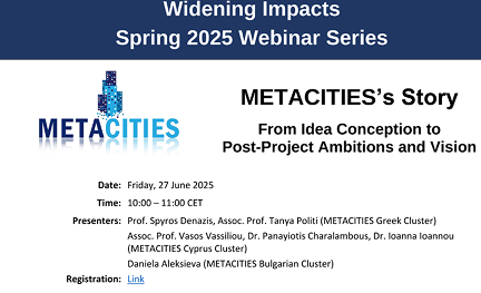 As part of the Widening Impacts Spring 2025 webinar series, this session spotlighted METACITIES, an Excellence Hub working to build smart, resilient, and inclusive cities. Participants explored how urban innovation ecosystems can drive visionary and sustainable development across borders.